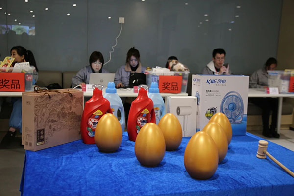 工作人員提前布置場(chǎng)地,在食堂的休息區(qū)掛上了滿滿的燈謎,隨著午餐后“活動(dòng)開始”的一聲令下,大家蜂擁而至,在燈謎區(qū)苦苦思索和尋找。看到能猜出的燈謎,便立馬拿下,沖向兌獎(jiǎng)區(qū)兌換小禮品,同時(shí)增加積分。隨著燈謎越來(lái)越少,活動(dòng)也逐漸進(jìn)入了高潮。最終,六名選手脫穎而出,獲得了砸金蛋的機(jī)會(huì),最多的一位猜出了九條燈謎。砸金蛋,得大獎(jiǎng),公司為大家準(zhǔn)備了吹風(fēng)機(jī)、電風(fēng)扇等獎(jiǎng)品。