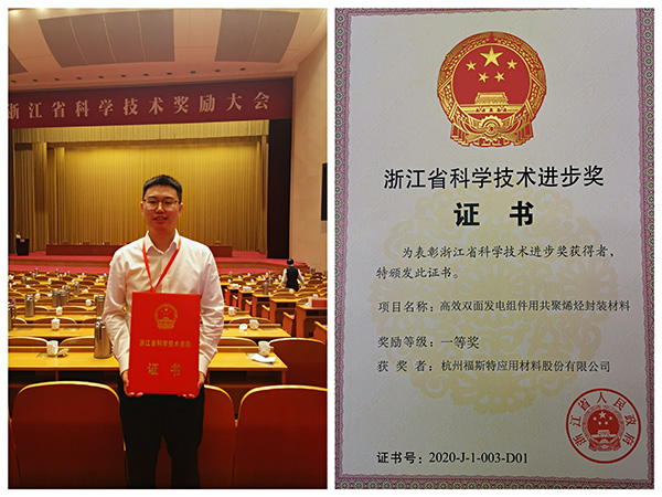 6月15日下午,浙江省科學(xué)技術(shù)獎勵大會在浙江省人民大會堂隆重舉行,由杭州福斯特應(yīng)用材料股份有限公司和浙江大學(xué)共同完成的 “高效雙面發(fā)電組件用聚烯烴封裝材料”項(xiàng)目榮獲浙江省科技進(jìn)步一等獎。