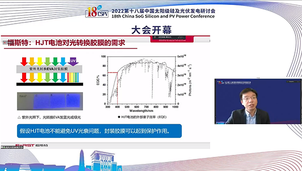 2022年12月8日至10日,第十八屆中國太陽級硅及光伏發(fā)電研討會(18th CSPV)在山西太原舉行。本次會議采取線上論壇的形式召開,福斯特等光伏企業(yè)協(xié)辦。在會議首日主會場論壇中,福斯特總經(jīng)理周光大博士針對光伏市場主流的新電池技術(shù)闡述了福斯特的理解,提出了專業(yè)的解決方案,并做了題為《新型高效電池的封裝方案》的報(bào)告。