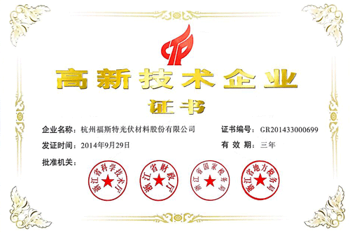 高新技術(shù)企業(yè)是政府和社會(huì)對(duì)福斯特在光伏材料封裝領(lǐng)域科研創(chuàng)新領(lǐng)域成果轉(zhuǎn)化能力的認(rèn)可,也是公司堅(jiān)持“創(chuàng)新技術(shù)為明天”理念的充分體現(xiàn),為公司發(fā)展提供了更優(yōu)惠的政策和更廣闊的舞臺(tái)。