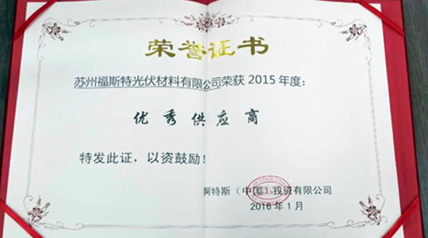 2016年開(kāi)年之際,福斯特再獲佳績(jī)。1月20日,蘇州福斯特光伏材料有限公司應(yīng)邀參加阿特斯年度供應(yīng)商頒獎(jiǎng)活動(dòng),并榮獲阿特斯2015年度優(yōu)秀供應(yīng)商。