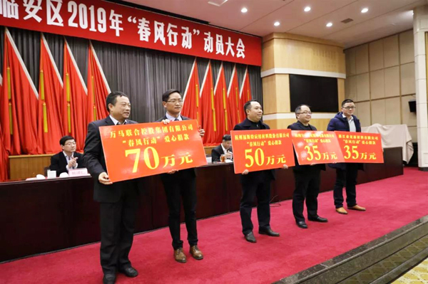 為貫徹落實黨的十九大精神,圍繞區(qū)委區(qū)政府提出的努力打造有溫度的“善城”,實現(xiàn)精準扶貧、精準脫貧,全面增進困難群眾民生福祉。1月4日,臨安區(qū)2019年“春風行動”動員大會舉行。啟動儀式上,福斯特與臨安區(qū)另外3家企業(yè)率先捐款,其中,福斯特捐款50萬元。區(qū)委、區(qū)政府領導也紛紛帶頭捐款,幫助困難群眾。