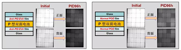 雙面電池組件正面、背面均可受光發(fā)電。因背面發(fā)電,電站端可額外增益5%-30%,發(fā)展優(yōu)勢明顯。同時,雙面電池技術(shù)可兼容IBC、HIT、MBB、半片、疊瓦等多種主流技術(shù),是光伏組件高效之路的首選技術(shù)路線。雙面電池在快速發(fā)展的同時,其因PERC電池背面鈍化不完全而引發(fā)的PID問題凸顯。如無特別防護(hù),雙面電池的背面PID衰減可達(dá)15%-50%。用常規(guī)抗PID的EVA及通用POE膠膜均無法實現(xiàn)長效的抗PID。