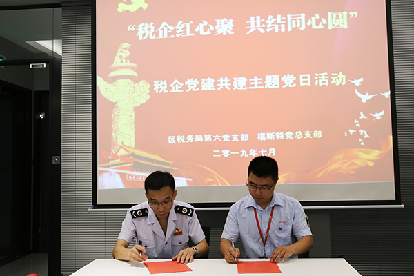 7月3日,主題黨日活動在福斯特總部舉行。雙方黨員代表根據(jù)活動主題進行了“微課演講”,加強企業(yè)供求同頻共振,開拓視野,啟迪思維。會中,雙方共同簽訂了《稅企黨建共建協(xié)議》,建立了稅企黨建合作新模式,通過共建共享進行優(yōu)勢互補。座談會上,稅務(wù)局服務(wù)團對企業(yè)代表提出的問題進行了現(xiàn)場輔導解答,充分把握企業(yè)涉稅需求,服務(wù)企業(yè)健康發(fā)展?;顒又校h員們在黨旗下重溫了入黨誓詞,鞭策自己以更高昂的精神、更扎實的作風踐行對黨的莊嚴承諾。