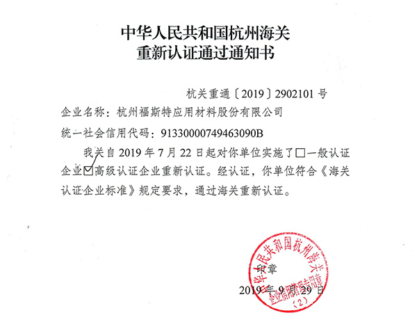 日前,福斯特順利通過了標(biāo)準(zhǔn)改版升級后海關(guān)AEO高級認(rèn)證的重新認(rèn)證,獲中華人民共和國杭州海關(guān)頒發(fā)的重新認(rèn)證通過通知書(杭關(guān)重通[2019]2902101號),標(biāo)志福斯特管理體系得到了海關(guān)AEO高級認(rèn)證的驗審認(rèn)可。
