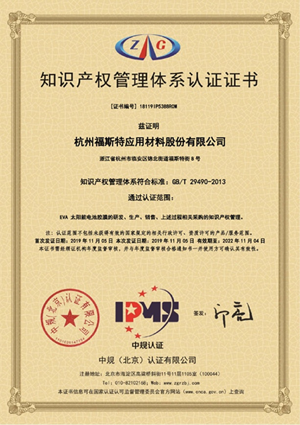 杭州福斯特應(yīng)用材料股份有限公司于2019年11月5日順利通過知識(shí)產(chǎn)權(quán)管理體系認(rèn)證(貫標(biāo)認(rèn)證),獲得中規(guī)(北京)認(rèn)證有限公司頒發(fā)的認(rèn)證證書,標(biāo)志著我公司在知識(shí)產(chǎn)權(quán)管理體系的建立、實(shí)施工作中取得階段性成果,在知識(shí)產(chǎn)權(quán)創(chuàng)造、運(yùn)用、管理和保護(hù)方面全面具備國(guó)內(nèi)領(lǐng)先水平。