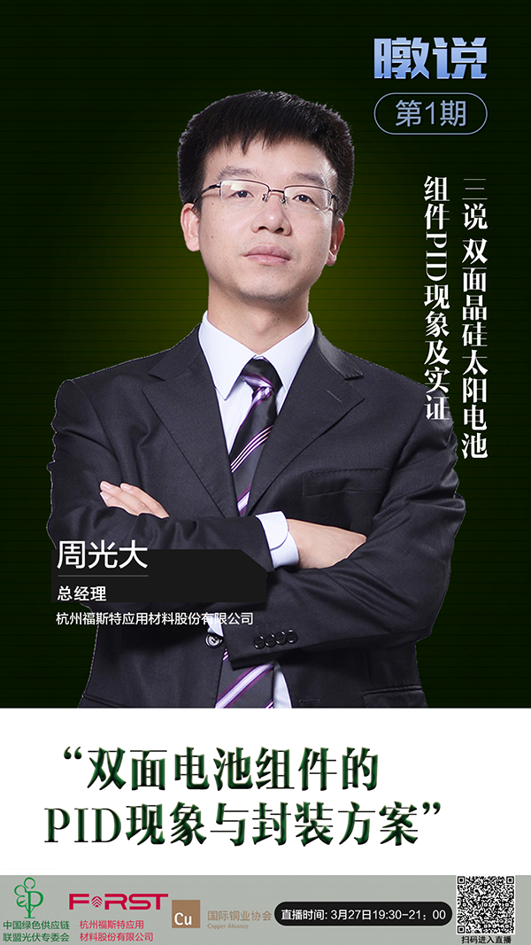 中國綠色供應(yīng)鏈聯(lián)盟光伏專委會(ECOPV)線上課堂“暾說微講堂”第一期將于3月27日開啟。福斯特總經(jīng)理周光大應(yīng)邀發(fā)表“雙面電池組件的PID現(xiàn)象與封裝方案”主題演講。